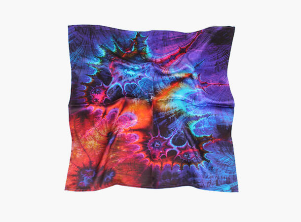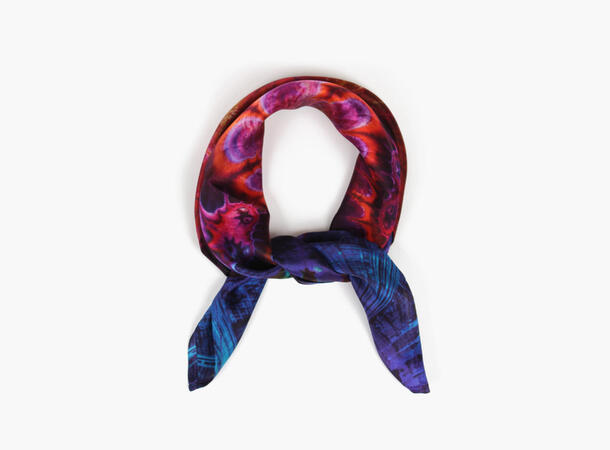 Designet kombinerer intense nyanser av lilla, rødt og blått i et kunstnerisk mønster som minner om abstrakt natur eller undervannsscener. Skjerfet er håndsydd i Italia og representerer det ypperste av kvalitet og håndverk. Bruk det rundt halsen, i håret, på vesken eller som et luksuriøst armbånd – dette skjerfet gir deg et stilfullt uttrykk uansett hvordan du styler det.